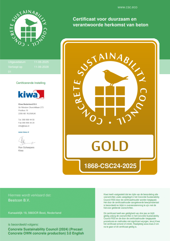 Het CSC-certificaat (Concrete Sustainability Council) is een internationaal erkend keurmerk dat aantoont dat betonproducten op een verantwoorde en duurzame manier worden geproduceerd. Daarbij wordt gekeken naar onder meer de herkomst van grondstoffen, milieubeheer, arbeidsomstandigheden en transparantie in de keten