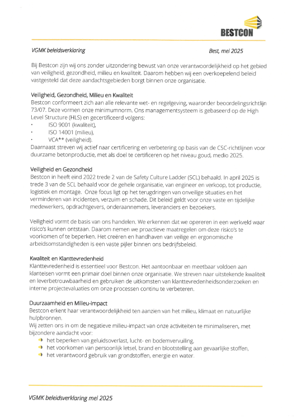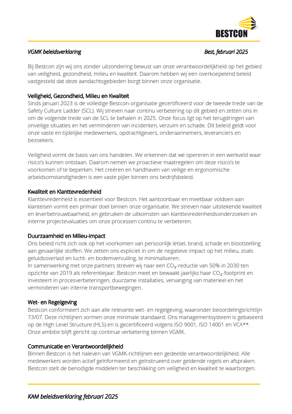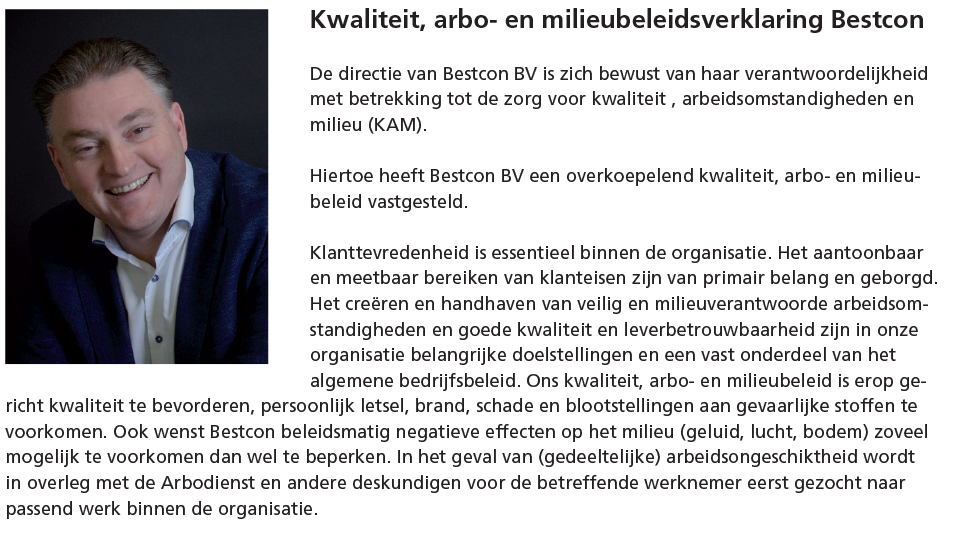 Binnen Bestcon zijn we ons bewust van onze verantwoordelijkheid met betrekking tot de zorg voor veiligheid, kwaliteit, arbeidsomstandigheden en milieu. Daarom hebben we een overkoepelend beleid vastgesteld.