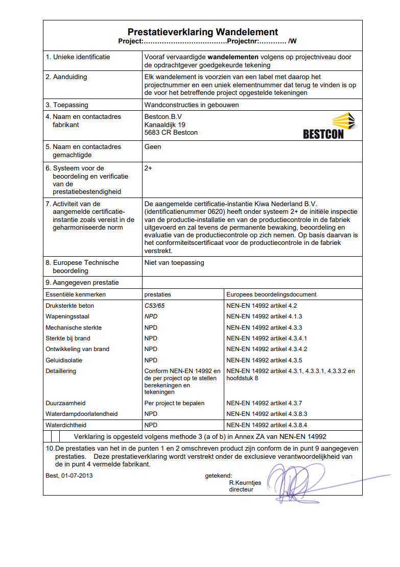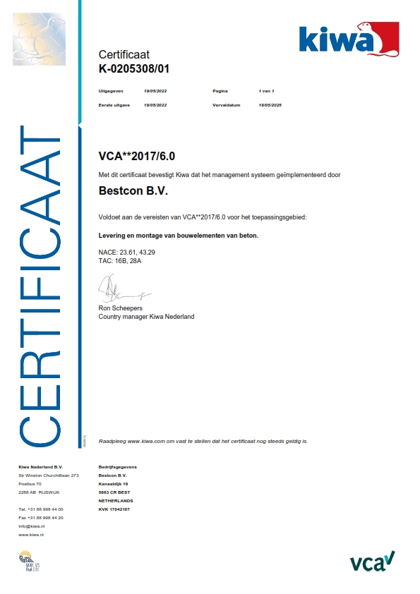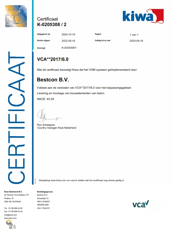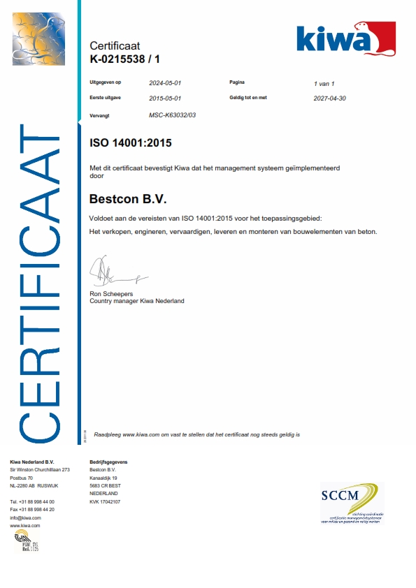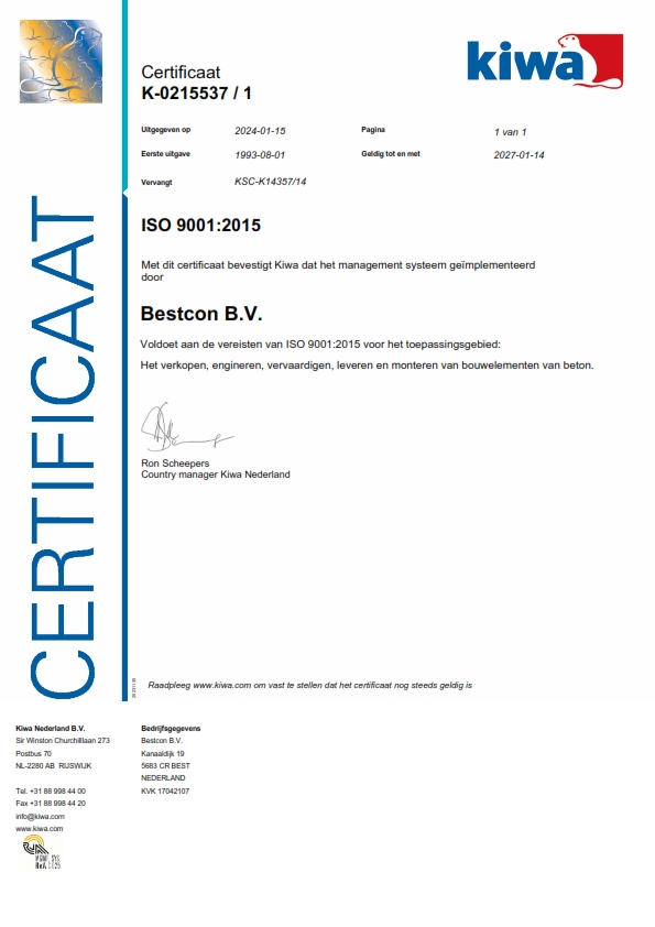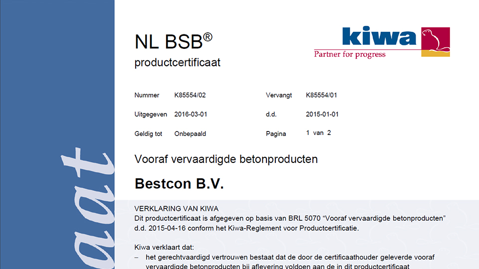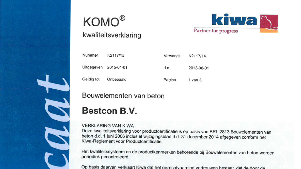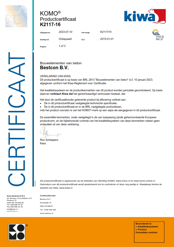 Onze opdrachtgevers moeten kunnen rekenen op de zekerheid dat de door ons geleverde prefab bouwelementen van beton voldoen aan de gestelde eisen. Met het KOMO product certificaat BRL 2813 kunnen we deze zekerheid bieden en onze kwalitatieve prestaties aantonen.
