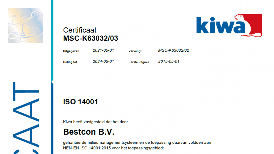 ISO 14001 gaat over het beheersen en verbeteren van prestaties op milieugebied (d.m.v. een milieumanagementsysteem). Het ISO 14001 certificaat is terecht een veel voorkomende eis in aanbestedingen bij bedrijven en overheid. Wij onderschrijven het belang van een krachtig milieubeleid en zijn er dan ook trots op ISO 14001-gecertificeerd te zijn.