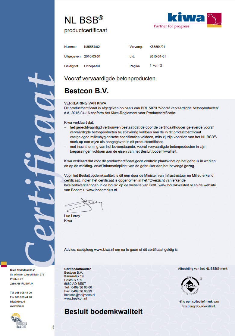 BRL5070 heeft betrekking op de milieu hygiënische eisen van prefab betonproducten die in contact kunnen komen met hemelwater, grondwater en/of oppervlaktewateren. Met het erkende certificaat op basis van BRL 5070, laten we zien dat aan het Besluit bodemkwaliteit wordt voldaan.