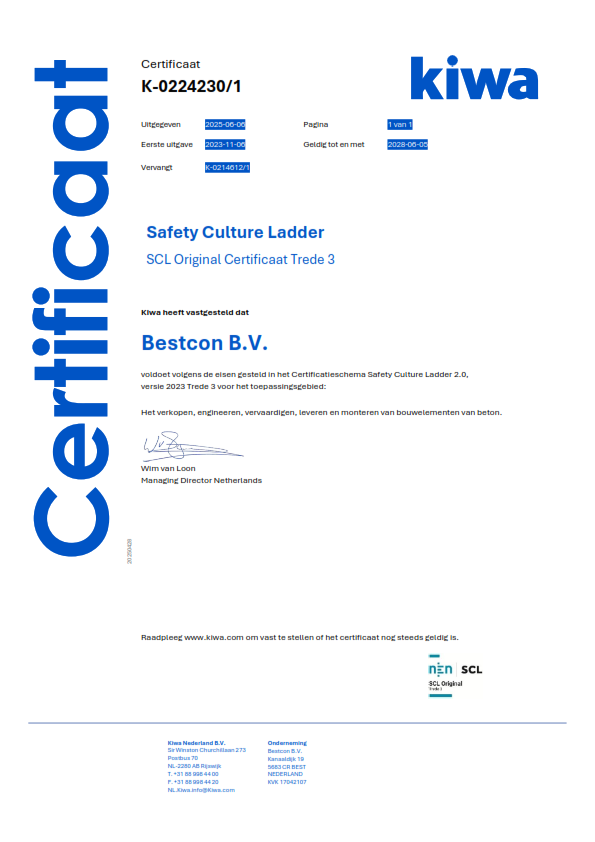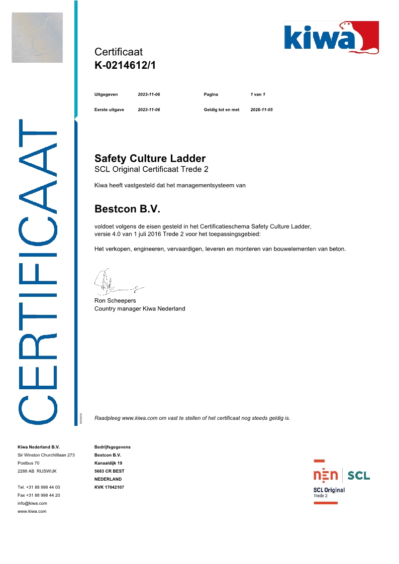 De Safety Culture Ladder (de Veiligheidsladder) is een methode om het veiligheidsbewustzijn van organisaties meetbaar, inzichtelijk en vergelijkbaar te maken. De ladder kent vijf treden, van pathologisch (trede 1) tot vooruitstrevend (trede 5). Wij hebben ons SCL-gecertificeerd omdat we bewust aandacht willen hebben en houden voor het terugdringen van het aantal onveilige situaties met minder incidenten (verzuim, schades) tot gevolg.