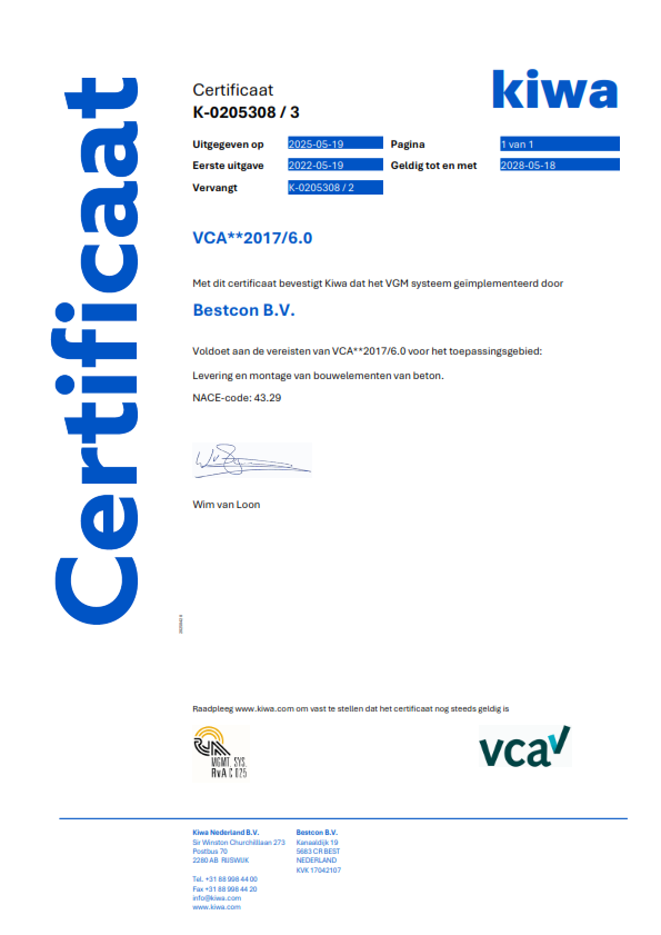 VCA is een programma waarin diverse branches in de industrie hun kennis en ervaring op het gebied van veilig en gezond werken hebben gebundeld. Met een VCA-certificaat wordt de basis gelegd om iedere dag weer veilig en gezond aan de slag te gaan. Voor ons was het behalen van de twee sterren VCA een bewuste keuze. Veiligheid gaat immers verder dan alleen maar het afvinken van een checklistje. Het vormt een integraal onderdeel van onze bedrijfsvoering.