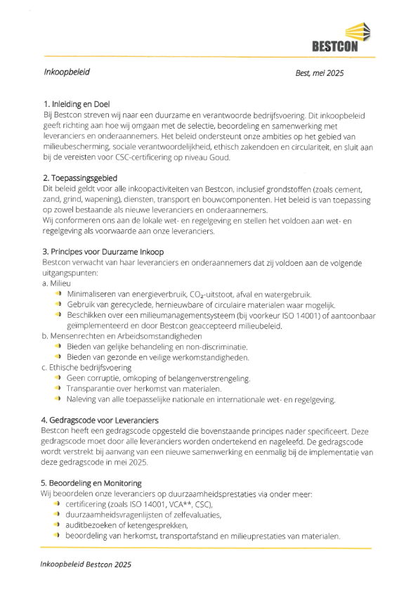 Bij Bestcon streven we naar een duurzame en verantwoorde bedrijfsvoering. Ons inkoopbeleid geeft richting aan hoe wij omgaan met de selectie, beoordeling en samenwerking met leveranciers en onderaannemers. Het beleid ondersteunt onze ambities op het gebied van milieubescherming, sociale verantwoordelijkheid, ethisch zakendoen en circulariteit, en sluit aan bij de vereisten voor CSC-certificering op niveau Goud.