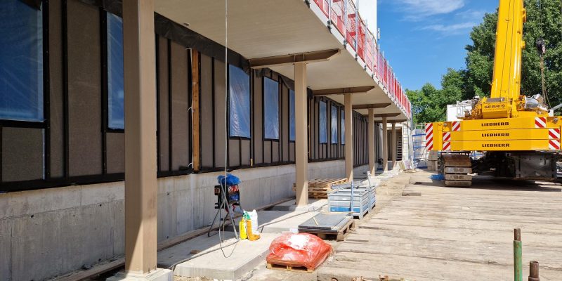 In fase 2 wordt de korte zijde van de L gebouwd: twee beuken naast elkaar, wederom zeven lagen hoog. “Elke laag monteren we in één dag,” zegt Hans. “Dat kan alleen als alle partijen (van HSB tot staal en van prefab modules tot de benodigde losse bouwkundige hijsjes) hun planning naadloos afstemmen.”