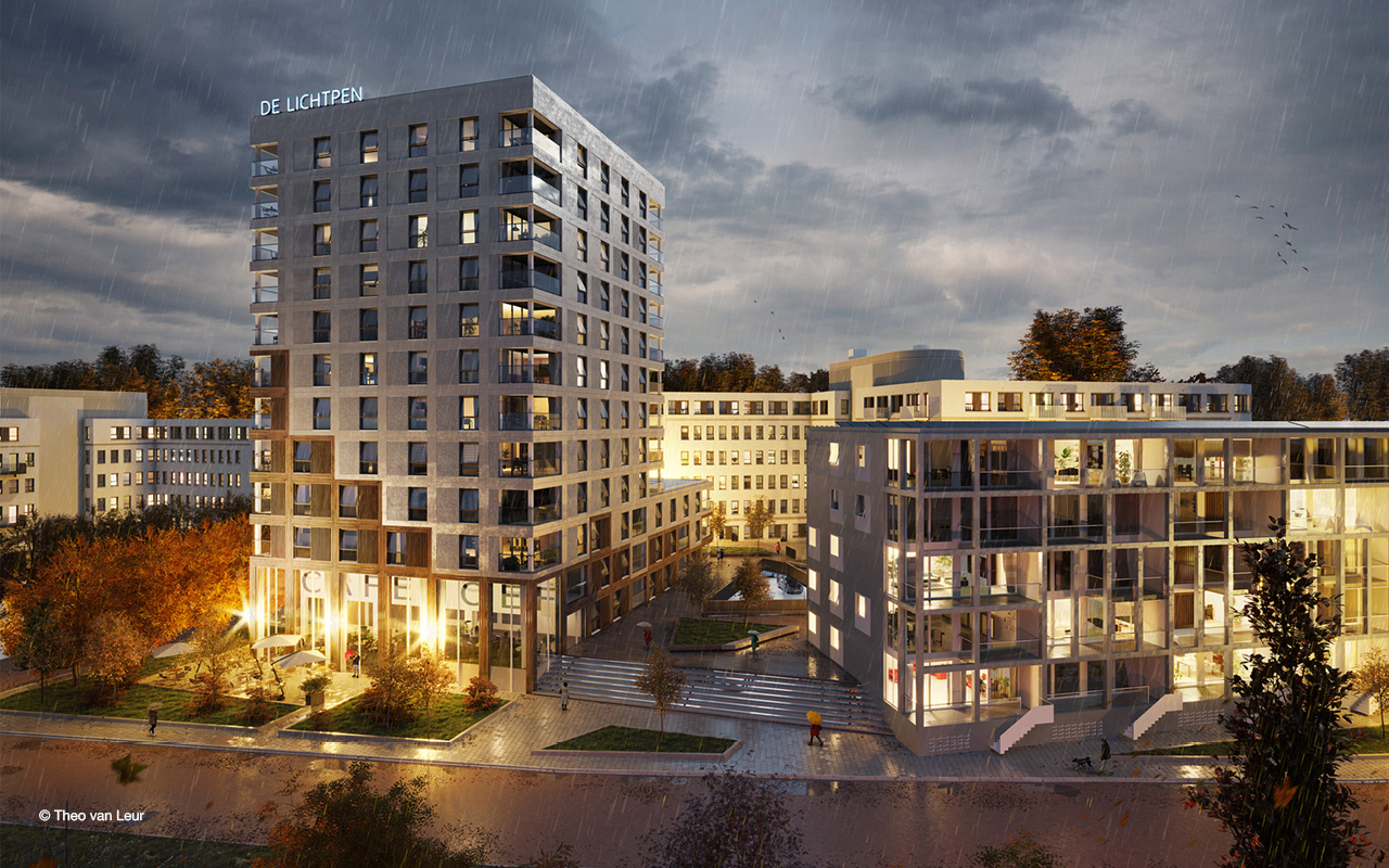 De Hoef Amersfoort wordt langzaam getransformeerd van een kantorenwijk naar een gemengd stedelijk gebied, waar ruimte is voor wonen, werken, leren en ontspannen. ‘De Lichtpen’, zoals het nu heet, is een van de eerste aanzetten tot deze transformatie. In het gehele project staat groen, energiezuinigheid en klimaat adaptieve kenmerken centraal.