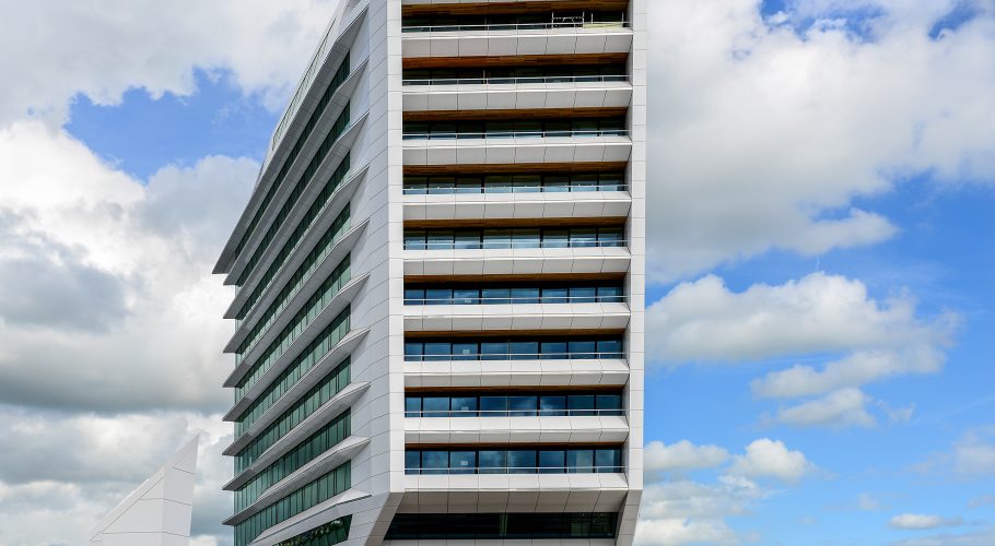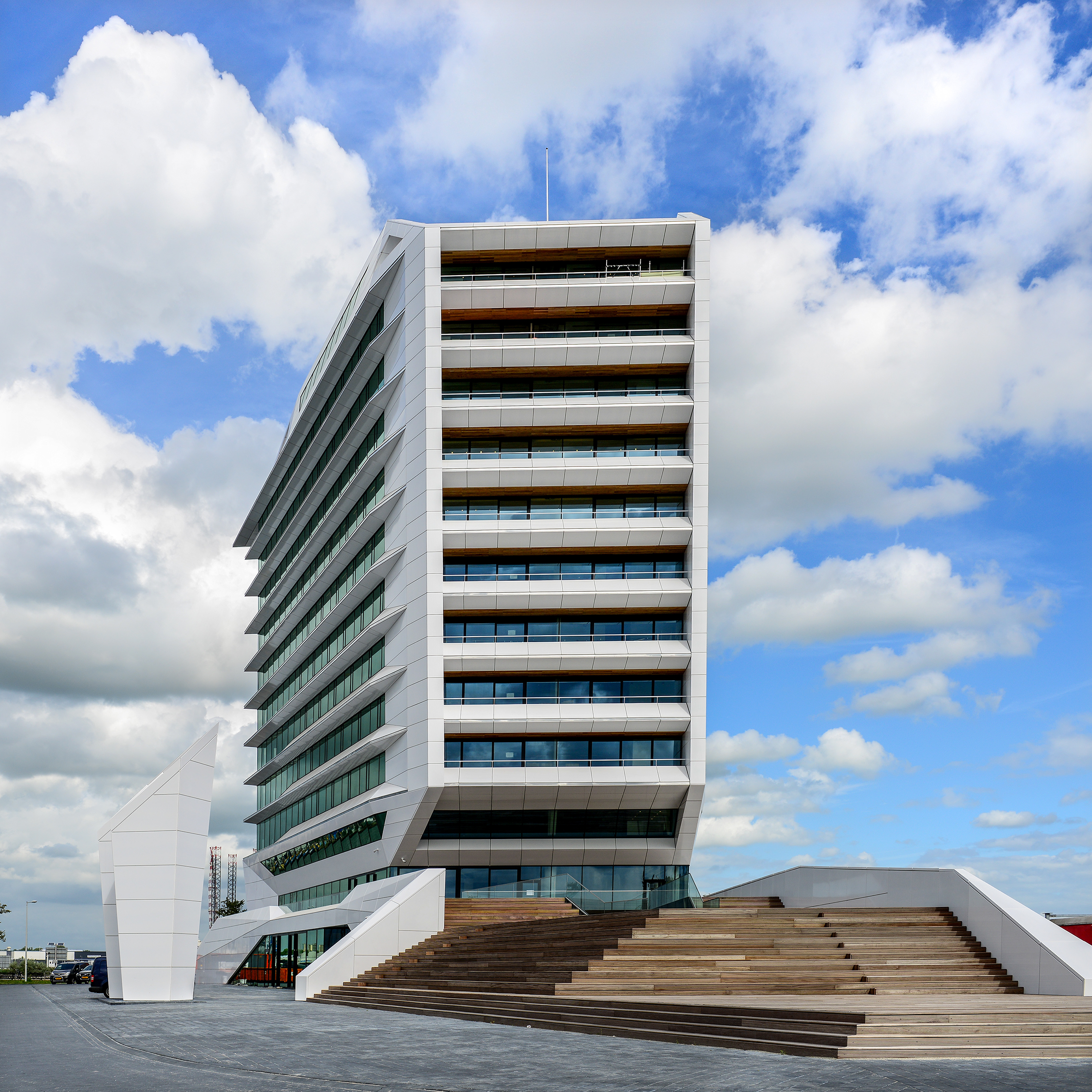 Dit spectaculair uitziende kantoorgebouw met een spannende helling en een indrukwekkende luifel is opgetrokken uit prefab beton met een in het werk gestorte kern.